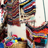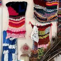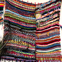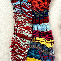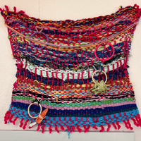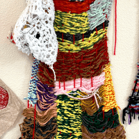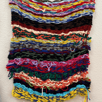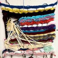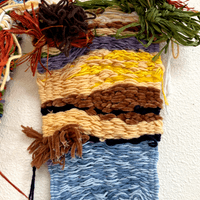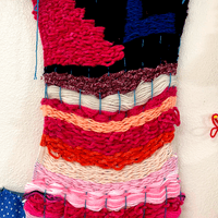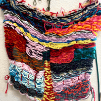 Daniel is a prolific fiber artist, eagerly experimenting with various mediums and weaving methods. He crafts his own looms with cardboard to make what he calls blankets, which grow and change to become elaborate wall tapestries. Daniel often encorporates objects like beads and ribbon in to his yarn weavings and is exploring different forms that can be created using these materials and trying different weaving patterns.
